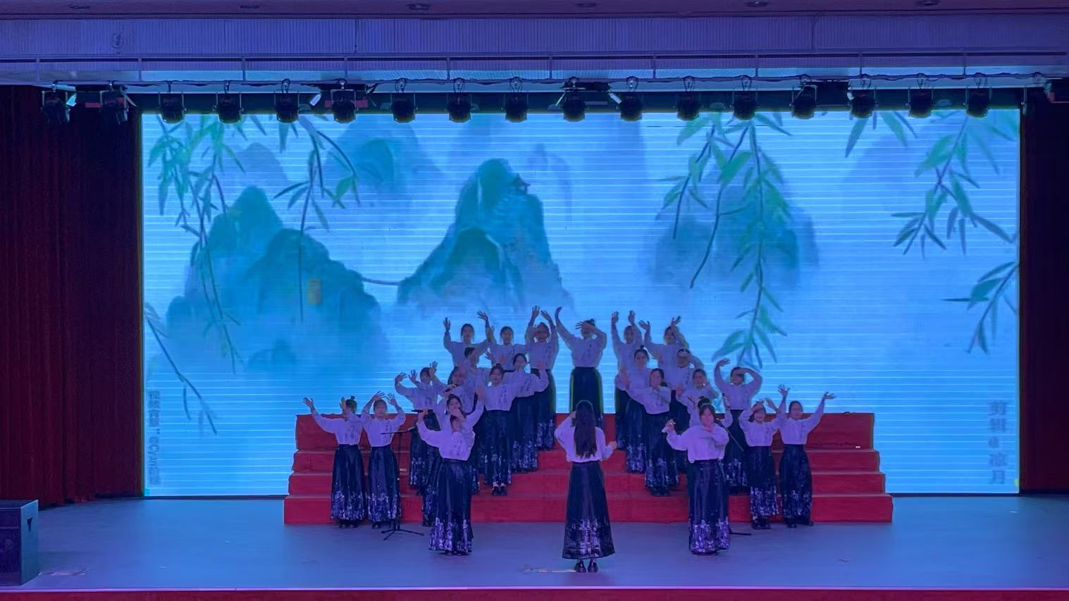比赛开始前,辅导员陈明彦和在场学生共同献上合唱《海阔天空》,激昂的声音和饱满的热情为即将离校,踏上新征程的2022级同学送上了一份特殊而暖心的毕业祝福。胡欣彤、肖遥愉悦等同学的舞蹈《九州同》气势磅礴、惊艳亮相,瞬间点燃全场,拉开了比赛的帷幕。